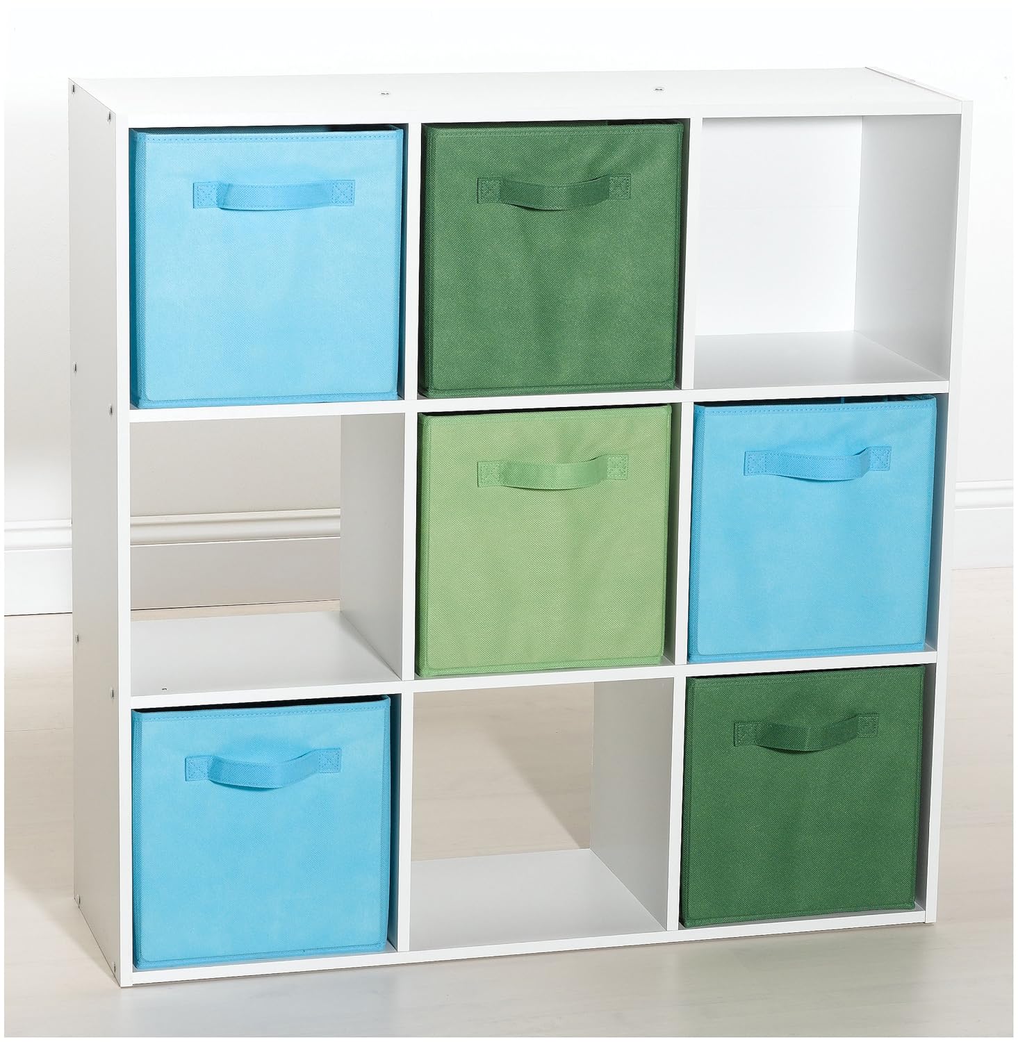 3 x 3 cube organizer with 5 fabric bins in green, orange, and blue